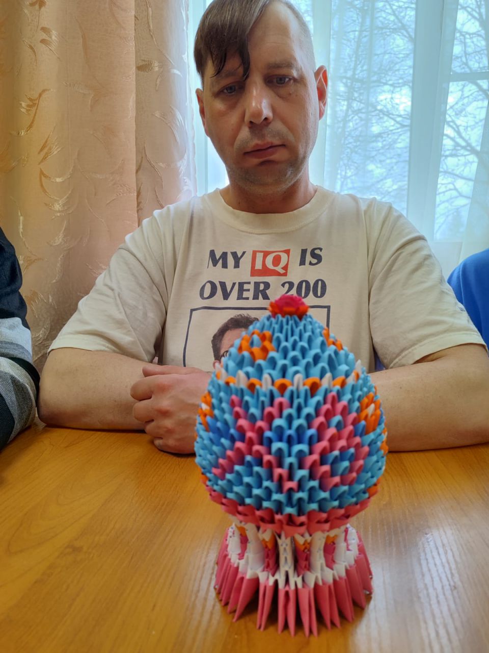 А наш творческий житель Максим Машинистов в группе единомышленников создали коллективную работу по модульному оригами в виде большого пасхального яйца.